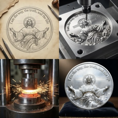 The obverse features a powerful religious motif. At the center stands a depiction of Jesus, with outstretched arms, symbolizing love, salvation, and guidance. Clad in a white robe with golden accents, his serene presence conveys peace, hope, and spiritual guardianship. Behind him, a radiant cross and subtle light rays evoke divine presence and enlightenment. Encircling the design is the inscription "I am the way, the truth, and the life" – a timeless biblical declaration that anchors the coin’s spiritual significance.