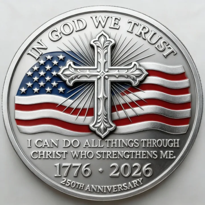 On the reverse, a prominent ornate cross takes center stage, symbolizing Christian faith. Behind it, the American flag waves proudly, embodying patriotism and national identity. Radiating from the cross are light rays, representing divine inspiration. Encircling the design are the inscriptions "IN GOD WE TRUST", "I CAN DO ALL THINGS THROUGH CHRIST WHO STRENGTHENS ME", and "1776 • 2026 250TH ANNIVERSARY" – merging spiritual conviction with the celebration of America’s 250th anniversary.