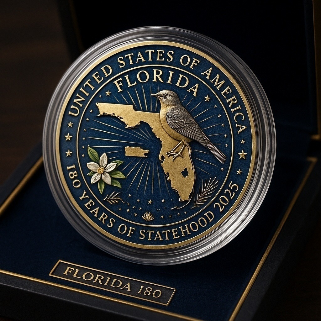 Featuring the proud symbols of Florida — the alligator, orange blossom, and mockingbird — this coin honors 180 years of freedom, growth, and coastal beauty.