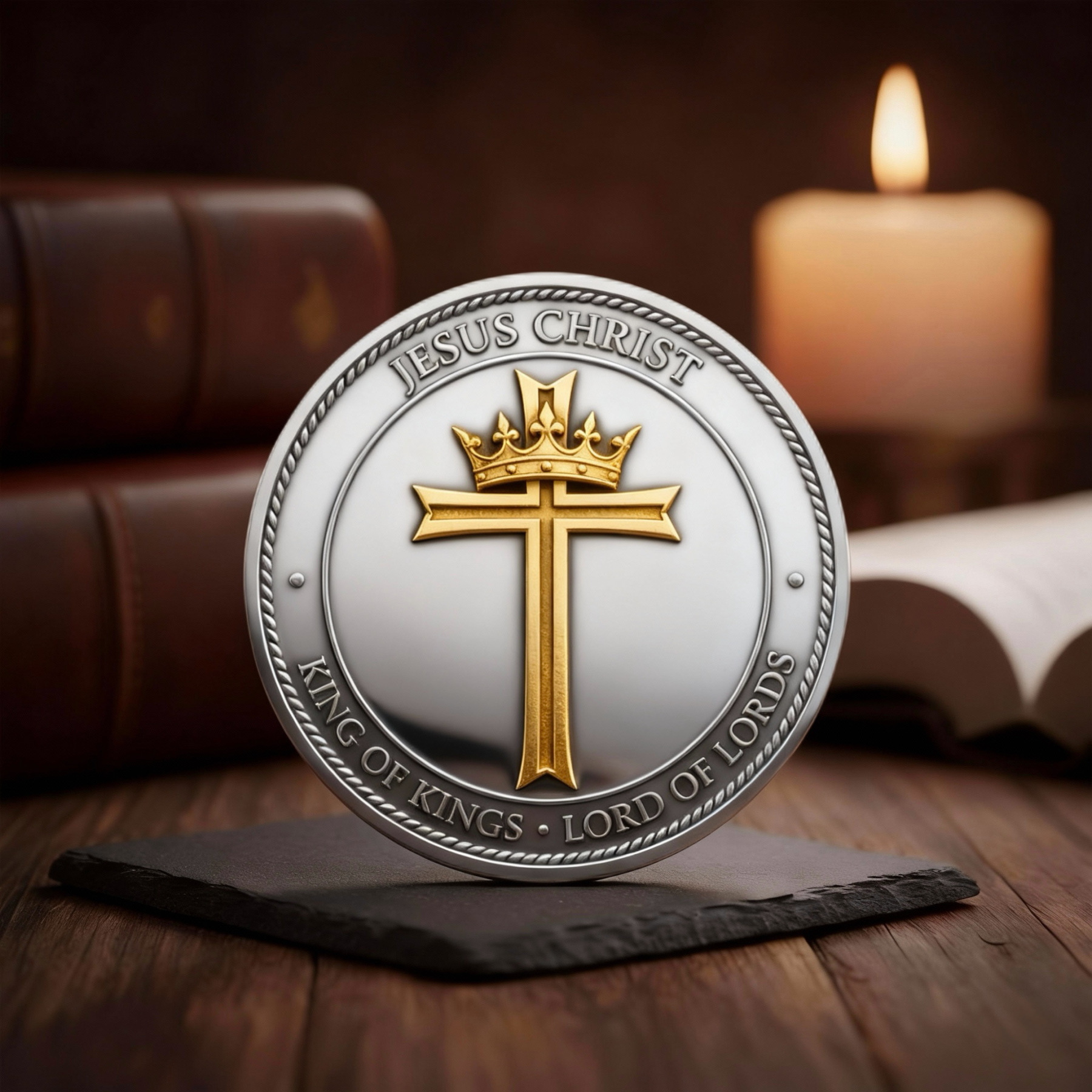 - Front: Features a gleaming gold crown atop a cross, set against a polished silver background. The bold inscription "JESUS CHRIST KING OF KINGS LORD OF LORDS" encircles the center, declaring the ultimate authority of Christ.
