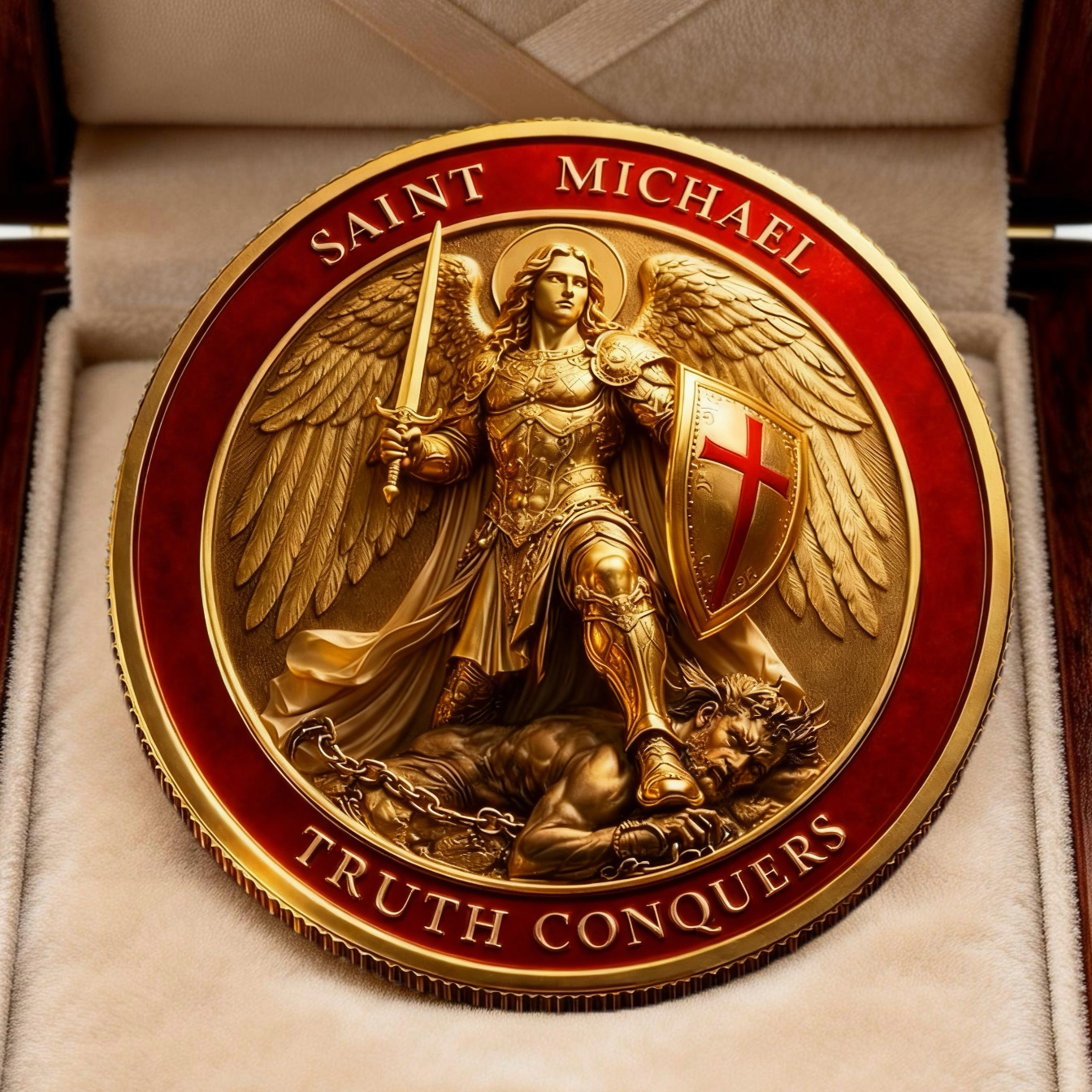 The reverse side displays Saint Michael the Archangel, standing victorious — sword raised, shield forward, evil defeated beneath his feet.