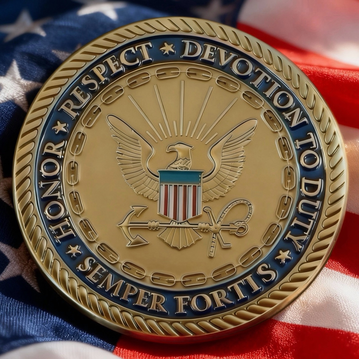 At the center is a naval-style emblem featuring an eagle, anchor, and shield, reflecting the strength, freedom, and mission of America’s maritime forces.