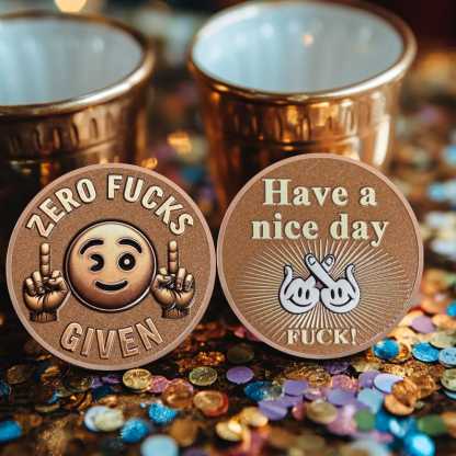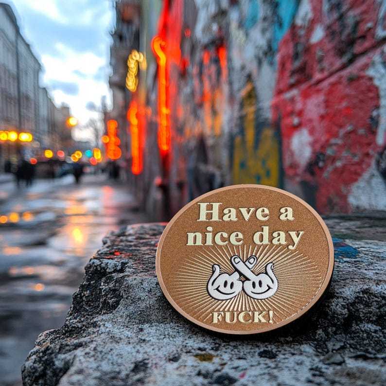 The reverse side of the “Asshole Coin” takes a humorous twist on politeness with a sarcastic edge. Featuring the phrase "Have a nice day" paired with playful hand gestures giving the middle finger, this design is the perfect blend of irony and rebellion. The bright rays emanating from the center emphasize the mockingly cheerful message, while the bold "FUCK!" at the bottom adds a final unapologetic punch. This side is perfect for those who love to express their humor in a bold, unconventional way.